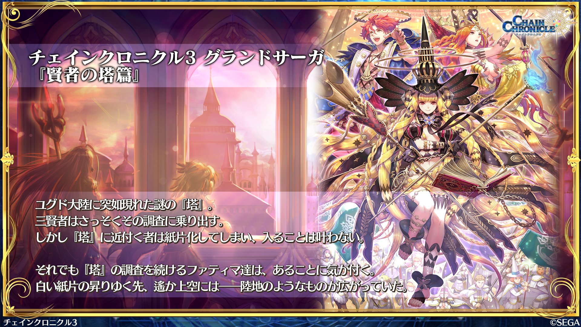 チェインクロニクル公式 En Twitter チェインクロニクル3 グランドサーガ情報 賢者の塔篇 6月4日 木 配信予定 突如現れた謎の 塔 の調査を行うファティマ達は あることに気が付く 白い紙片の昇りゆく先 遙か上空には 陸地のようなものが広がっていた